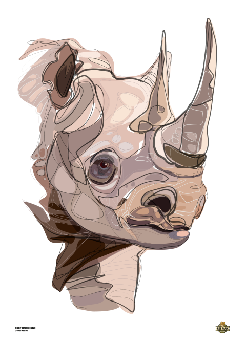 Plakat med motiv af sort næsehorn tegnet til Ree Park Safari.